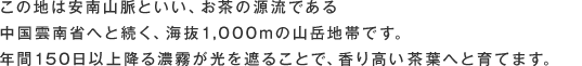この地は安南山脈といい、お茶の源流である中国雲南省へと続く、海抜1,000mの山岳地帯です。年間150日以上降る濃霧が光を遮ることで、香り高い茶葉へと育てます。